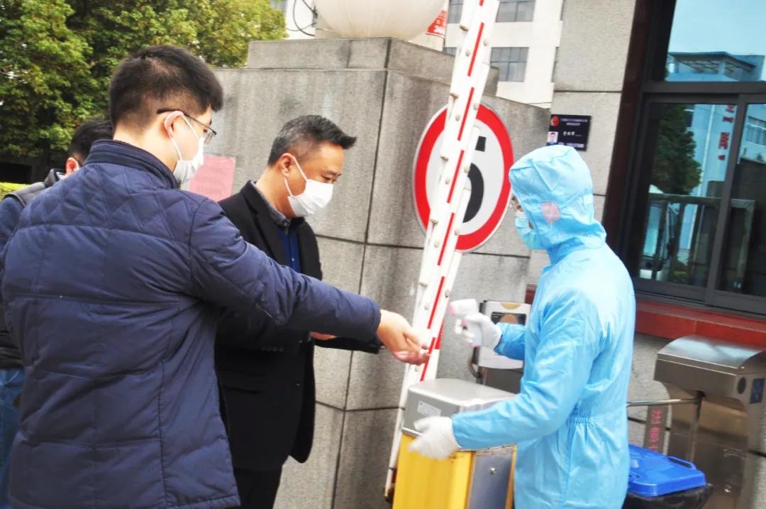 (圖為企業(yè)疫情防控小組成員在為來(lái)訪領(lǐng)導(dǎo)測(cè)量體溫)
