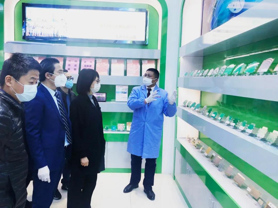 (圖為陳初讀為來(lái)訪領(lǐng)導(dǎo)介紹富仕德生產(chǎn)的5G微波覆銅基板)