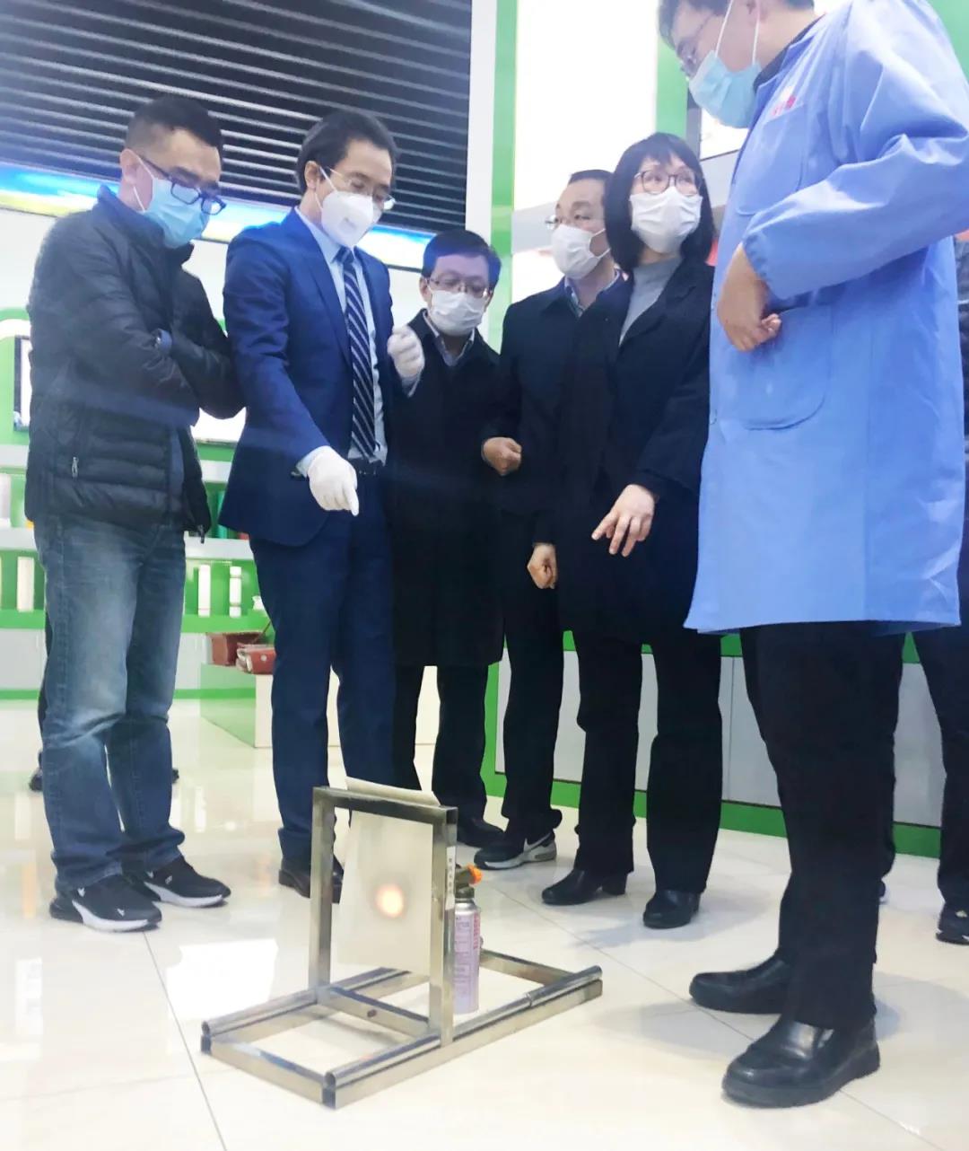 (圖為邵亞國(guó)為來(lái)訪領(lǐng)導(dǎo)展示我司特功紡產(chǎn)品的“不燃”試驗(yàn))