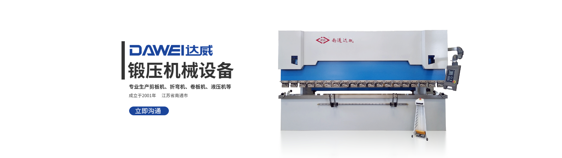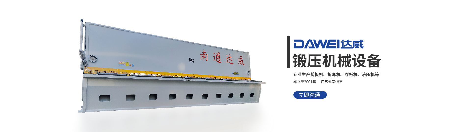 南通達威機床有限公司成立于2001年,國家高新技術企業,坐落于經濟發達的長江三角洲的江蘇名鎮---享有“剪折機床之鄉”的海安李堡鎮。公司分為一廠區:南通達威機床有限公司,二廠區:江蘇通快機械有限公司,是華東地區專業的機床制造企業。2006年,通過ISO9001質量管理體系認證2006年,被命名為過南通市AAA級重合同守信用企業2007年,被認定過江蘇省質量信得過企業2008年,品牌”威事達被授予過中國著名品牌2015年,通過歐盟CE認證2019年,被認定為國家高新技術企業公司經過多年的發展壯大,達威現已成為國內能提供完整的剪切、折彎、卷板、液壓加工產品線解決方案的專業金屬板材成形機床企業。其產···
